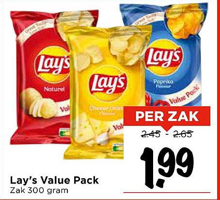 Bij de Vomar krijg je de Lay's Value Pack nu voor slechts €1,99 per zak, terwijl de normale prijs tussen de €2,45 en €2,65 ligt. Dat betekent dat je bij deze aanbieding flink kunt besparen! Dit is de ideale kans om voor jezelf of je gezelschap deze heerlijke chips in te slaan.