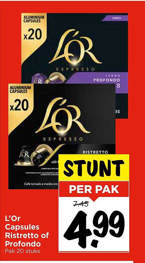 Bekijk nu de L’Or Capsules Ristretto of Profondo Pak 20 stuks aanbieding in de Vomar folder. Deze aanbieding is geldig van 02-04-2025 tot en met 05-04-2025.