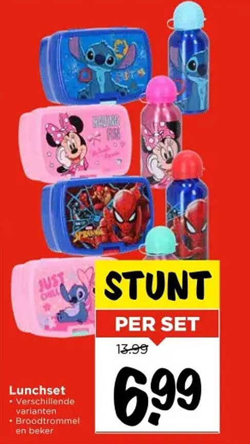 De lunchset biedt veelzijdigheid met verschillende varianten. De set bevat een broodtrommel en een beker, ideaal om tijdens de lunch of een picknick van te genieten. Bovendien zijn de vrolijke ontwerpen met populaire figuren als Stitch, Minnie Mouse, en Spiderman een echte hit onder kinderen. Dit maakt het niet alleen leuk om te gebruiken, maar ook een geweldige manier om kinderen te motiveren om hun lunch mee te nemen.