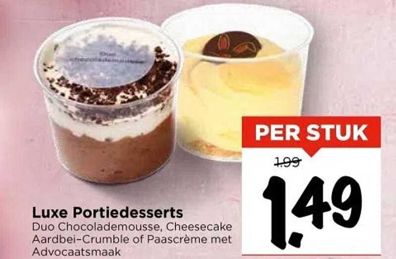 Maak je dessertmomenten extra speciaal met de Luxe Portiedesserts van Vomar! Deze heerlijke portiegrootte desserts zijn perfect voor elke gelegenheid, of je nu een feestje organiseert of gewoon jezelf wilt verwennen na een lange dag. Met een keuze uit Duo Chocolademousse, Cheesecake Aardbei-Crumble of Paascrème met Advocaatsmaak, is er voor ieder wat wils. De aanbieding loopt van 16 april tot en met 19 april 2025, dus mis deze kans niet!
