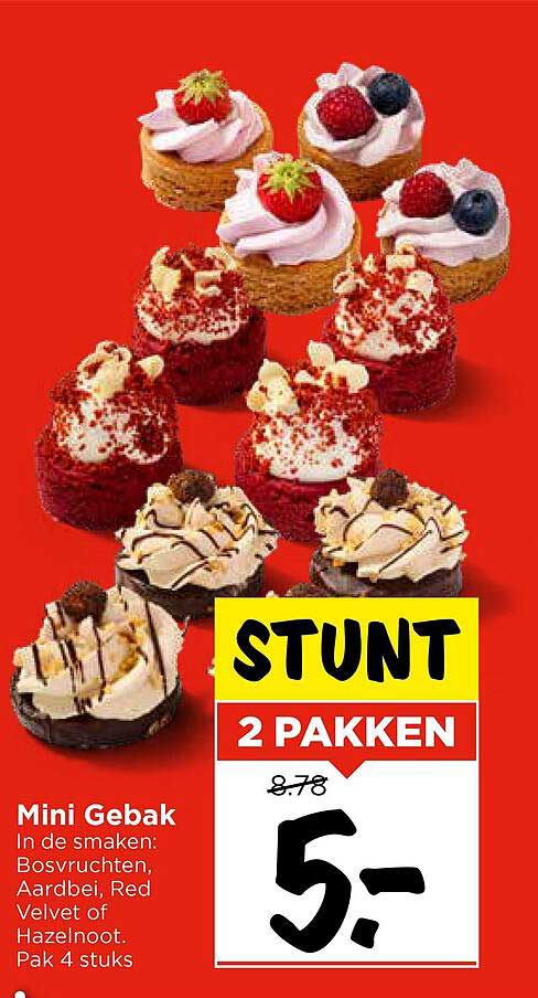 Ben je op zoek naar een heerlijke traktatie voor een feestje, een gezellige avond met vrienden of gewoon voor jezelf? Dan is deze aanbieding van Mini Gebak in de Vomar-folder precies wat je nodig hebt! Met verschillende smaken zoals bosvruchten, aardbeien, red velvet en hazelnoot, zit er voor iedereen wel iets lekkers tussen. Deze mini gebakjes zijn perfect om te delen of om lekker van te genieten tijdens een filmavond. Bovendien, met de actieprijs, profiteer je nu extra van deze zoete verleidingen.