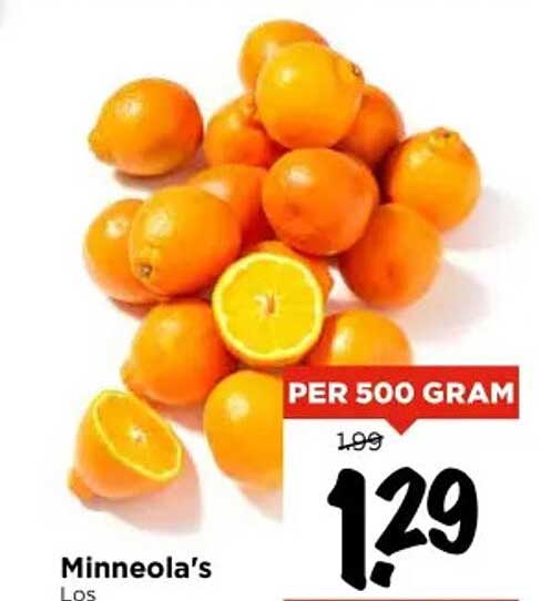 Vomar biedt Minneola's aan voor slechts €1,29 per 500 gram, vergeleken met de normale prijs van €1,99. Dit betekent dat je profiteert van een korting van 70 cent! Dit is een geweldige manier om op een budget te genieten van gezond fruit zonder in te boeten op smaak of kwaliteit.
