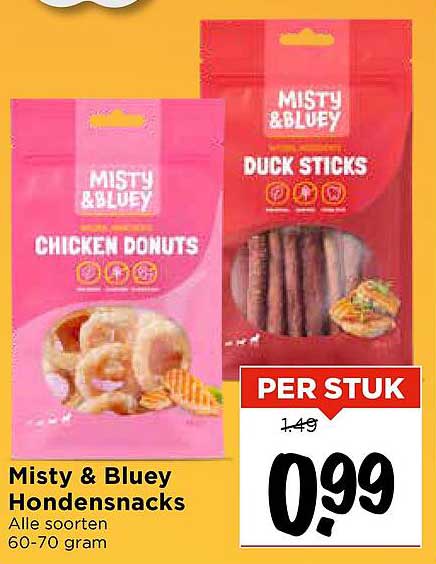 Bekijk nu de Misty & Bluey Hondensnacks - Alle soorten 60-70 gram aanbieding in de Vomar folder. Deze aanbieding is geldig van 02-10-2025 tot en met 04-10-2025.