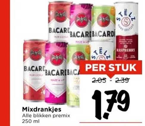 Ben je op zoek naar een verfrissend drankje voor de komende feestjes of borrels? Kijk dan niet verder, want hier vind je een geweldige aanbieding op mixdrankjes! In de Vomar-folder vind je deze heerlijke blikken premix van 250 ml voor de ongekend lage prijs van €1,79 per stuk. Met deze aanbieding bespaar je flink, want normaal kost een blikje tussen de €2,05 en €2,39. Perfect voor een ontspannen avond met vrienden of een feestje in de tuin.