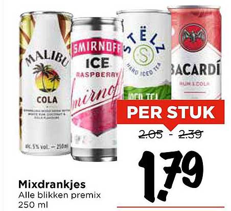 De aanbieding biedt deze mixdrankjes voor slechts €1,79 per stuk, terwijl de normale prijs tussen de €2,05 en €2,39 ligt. Dit betekent dat je flink bespaart! Of je nu enkel een paar blikjes nodig hebt of voor een groter gezelschap inslaat, dit is het moment om je voorraad aan te vullen!