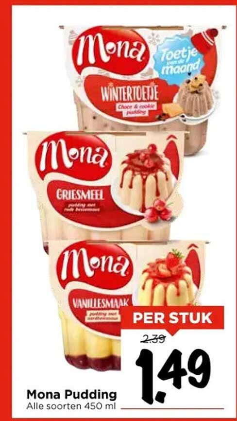 Bekijk nu de Mona Pudding aanbieding in de Vomar folder. Deze aanbieding is geldig van 29-12-2024 tot en met 04-01-2025.