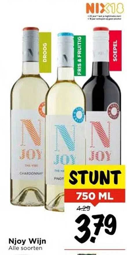 Ben je op zoek naar een heerlijke wijn voor een gezellige avond? Dan is deze aanbieding van Njoy Wijn perfect voor jou! Met de verschillende soorten waaronder Chardonnay en Pinot, kun je niet verkeerd gaan. Of je nu een etentje hebt of gewoon lekker wilt relaxen, deze wijn is de ideale keuze. En met de scherpe prijs van €3,79 is het nu het perfecte moment om in te slaan. De aanbieding is geldig van 23 oktober tot en met 25 oktober 2025, dus mis het niet!