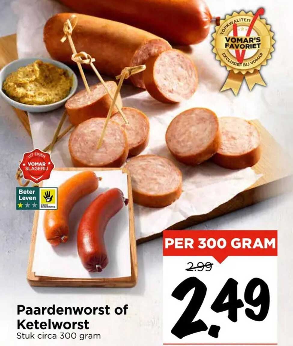 Ben je op zoek naar een smakelijke toevoeging aan je maaltijd of een lekker hapje voor tijdens een borrel? Kijk niet verder! Deze aanbieding van Vomar bevat de heerlijke Paardenworst of Ketelworst, perfect voor iedereen die houdt van een goede worst. Met een uitstekende prijs van slechts €2,49 per 300 gram, kun je deze traktatie nu nog voordeliger op de kop tikken!