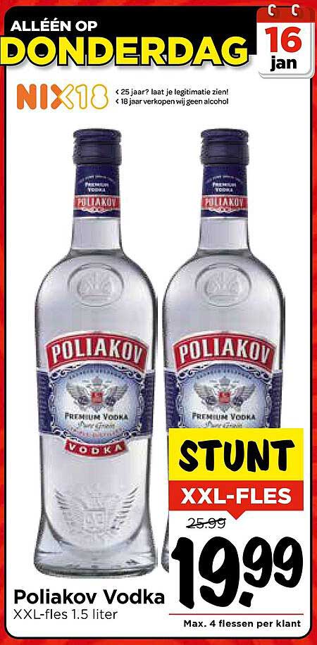 Bekijk nu de Poliakov Vodka XXL-fles 1.5 liter aanbieding in de Vomar folder. Deze aanbieding is geldig van 16-01-2025 tot en met 18-01-2025.