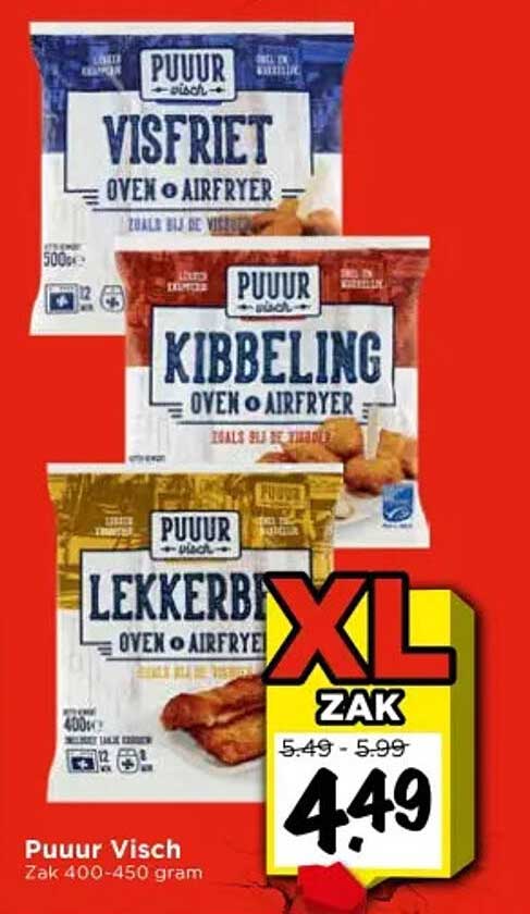 Bekijk nu de Puur Visch XL Zak - Visfriet, Kibbeling en Lekkerbek aanbieding in de Vomar folder. Deze aanbieding is geldig van 20-08-2025 tot en met 23-08-2025.