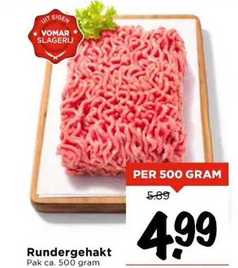 Normaal gesproken kost dit rundergehakt €5,89 per 500 gram, maar nu kun je het verkrijgen voor slechts €4,99! Dat betekent een directe besparing van €0,90. Dit is dus niet alleen een smakelijke keuze, maar ook een zeer voordelige aanbieding die je niet wilt missen.