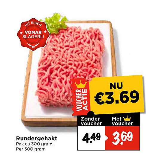 De reguliere prijs voor dit rundgehakt bedraagt €4,49, maar met de speciale voucheractie koop je het nu voor slechts €3,69! Dit betekent dat je niet alleen bespaart, maar ook verzekerd bent van een kwaliteitsproduct, ideaal voor je dagelijkse maaltijden.