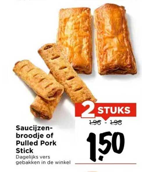 Bekijk nu de Saucijzenbroodje of Pulled Pork Stick aanbieding in de Vomar folder. Deze aanbieding is geldig van 18-09-2025 tot en met 20-09-2025.