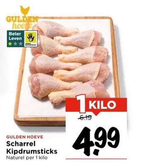 Ben je op zoek naar een smakelijke en voordelige toevoeging aan je maaltijd? Kijk dan niet verder! Deze aanbieding van scharrel kipdrumsticks van Gulden Hoeve is precies wat je nodig hebt. Ze zijn perfect voor een gezellige avond met vrienden of een lekker diner met het gezin. Dankzij de scherpe prijs van slechts €4,99 voor 1 kilo, haal je niet alleen kwaliteit in huis, maar ook een geweldige deal!