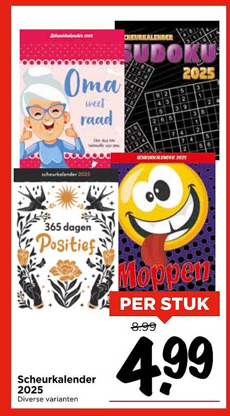 Ontdek de geweldige Scheurkalender 2025 aanbieding in de nieuwste Vomar folder. Naast deze aanbieding vind je nog veel meer aantrekkelijke kortingen. Je kunt de Scheurkalender 2025 eenvoudig online bestellen via de Vomar website of kopen in een winkel bij jou in de buurt.