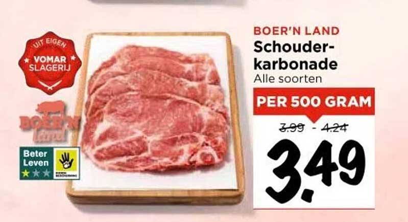 Normaal gesproken betaal je voor deze schouderkarbonade tussen de €3,99 en €4,24 per 500 gram. Maar met deze aanbieding profiteer je van een scherpe prijs van slechts €3,49. Dit is niet alleen een uitstekende kans om te besparen, maar ook om te genieten van vlees van hoge kwaliteit.