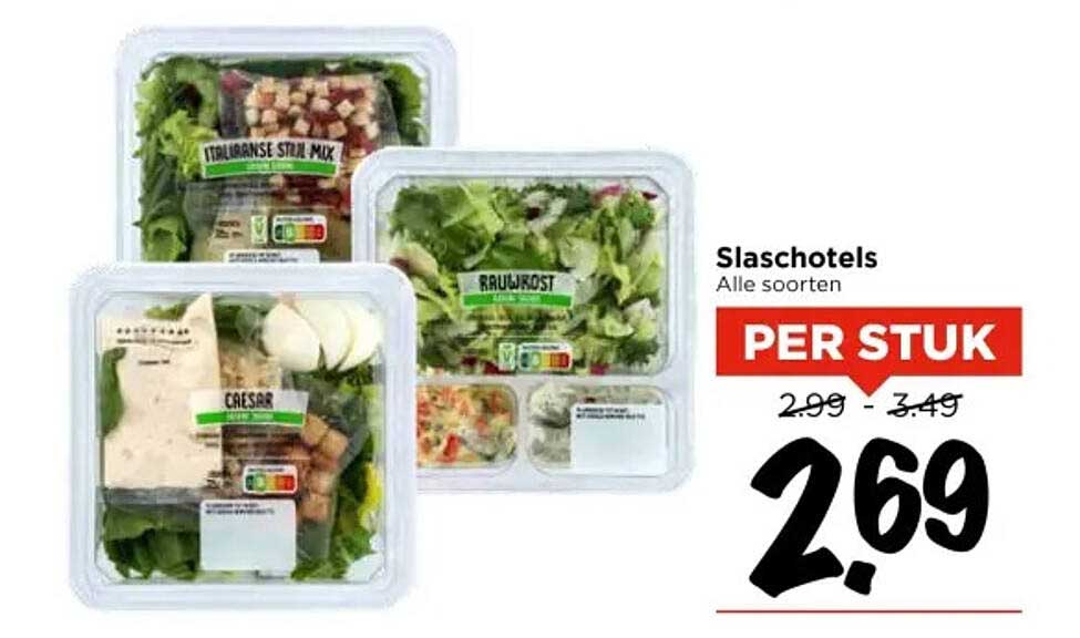 Normaal gesproken variëren de prijzen van deze Slaschotels tussen de €2,99 en €3,49. Met de aanbieding van €2,69 per stuk bespaar je tot wel €0,80! Dit is niet alleen financieel voordelig, maar het maakt het ook gemakkelijker om gezonder te eten zonder in te boeten op smaak. Maak gebruik van deze tijdelijke aanbieding en vul je koelkast met verschillende Slaschotels!