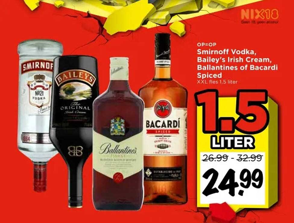 Bekijk nu de Smirnoff Vodka, Bailey's Irish Cream, Ballantines of Bacardi Spiced XXL flessen 1,5 liter aanbieding in de Vomar folder. Deze aanbieding is geldig van 09-10-2025 tot en met 11-10-2025.
