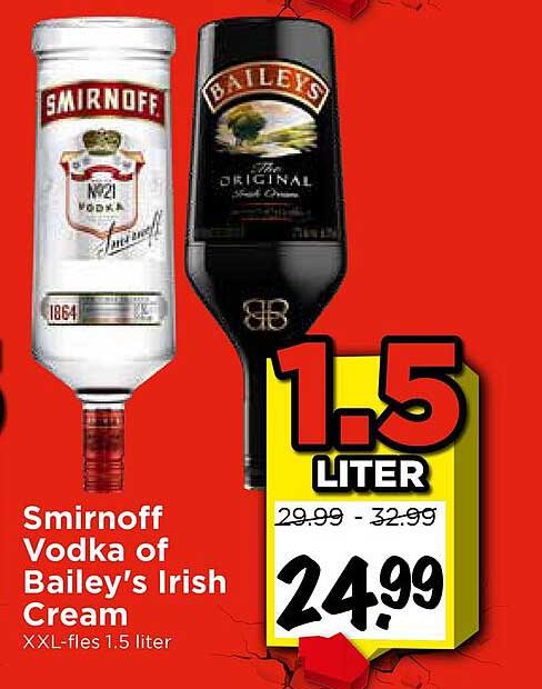 Bekijk nu de Smirnoff Vodka of Bailey's Irish Cream - XXL-fles 1.5 liter aanbieding in de Vomar folder. Deze aanbieding is geldig van 09-07-2025 tot en met 12-07-2025.