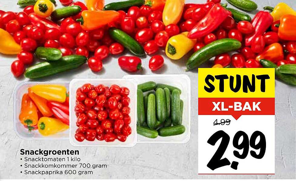 Maak kennis met de heerlijke snackgroenten die je eenvoudig in je dagelijkse voeding kunt verwerken. Deze aanbieding, geldig van 2025-05-11 tot en met 2025-05-17, biedt een XL-bak vol smaakvolle en gezonde snacks voor een aantrekkelijke prijs. Ideaal voor zowel tussendoortjes als toevoeging aan salades, dit is een kans die je niet wilt missen!