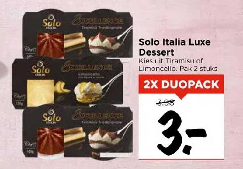Normaal gesproken kost een pakket Solo Italia Luxe Dessert €7,98, maar nu kun je profiteren van een geweldige korting. Voor slechts €3,- krijg je maar liefst twee stuks, wat dit een bijzonder aantrekkelijke aanbieding maakt. Waar wacht je nog op? Gun jezelf deze luxe en bespaar tegelijkertijd!