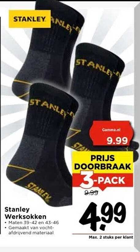 Normaal gesproken kost een 3-pack Stanley werksokken €9,99, maar deze aanbieding brengt de prijs naar een ongekende €4,99! Dit betekent een flinke besparing, wat deze deal extra aantrekkelijk maakt. Waarom zou je meer betalen als je kwalitatieve werksokken kunt krijgen voor een fractie van de prijs? Dit is een kans om je sokkenvoorraad aan te vullen zonder de bank te breken!