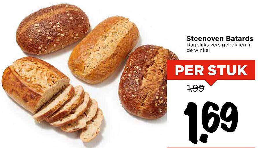 De reguliere prijs voor de Steenoven Batards bedraagt €1,99 per stuk. Tijdens deze aanbieding betaal je slechts €1,69 per stuk! Dit is een besparing van €0,30 per broodje, wat deze aanbieding extra aantrekkelijk maakt. Probeer ze nu en ervaar zelf de heerlijke smaak en versheid voor een lage prijs.