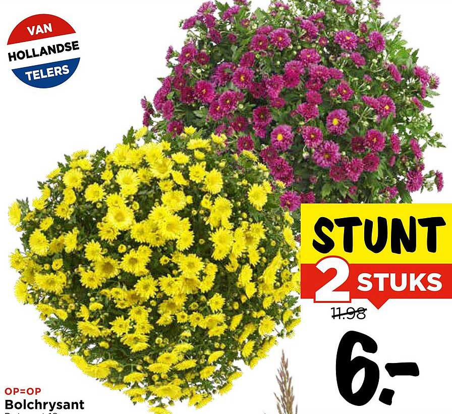 Ben je op zoek naar een kleurrijke aanvulling voor je tuin of balkon? Dan is de aanbieding van de Bolchrysant in de Vomar-folder zeker iets voor jou! Deze prachtige bloemen zijn niet alleen een lust voor het oog, maar met de aanbieding van 2 stuks voor slechts 6,- is het ook nog eens een uitstekende deal. Deze bloemen, afkomstig van Nederlandse telers, brengen leven en kleur in elke ruimte.