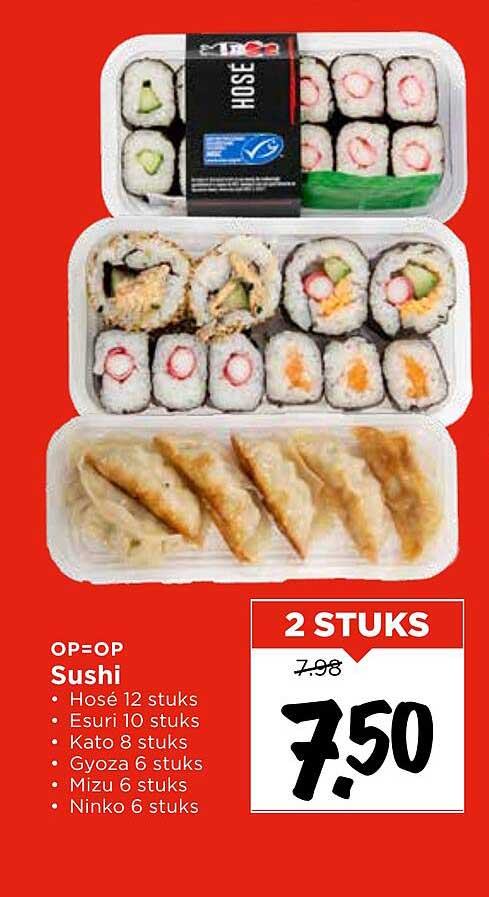 Normaal gesproken ligt de prijs voor deze heerlijke sushi rond de €7,98. Met deze aanbieding betaal je slechts €7,50 voor 2 stuks. Dat is een besparing die je niet wilt missen! Waarom zou je nog twijfelen? Grijp deze kans en geniet van de beste sushi in je buurt.