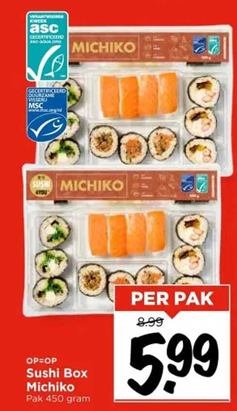 Bekijk de Sushi Box Michiko aanbieding bij Vomar! Deze fantastische aanbieding is nu beschikbaar in de nieuwste Vomar folder. Profiteer van deze kans en bespaar flink op je aankoop.