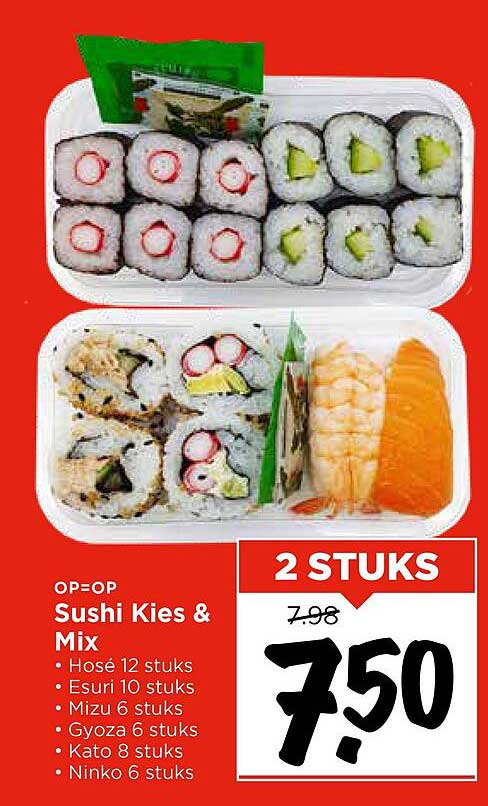 Bekijk nu de Sushi Kies & Mix 2 Stuks aanbieding in de Vomar folder. Deze aanbieding is geldig van 11-06-2025 tot en met 14-06-2025.