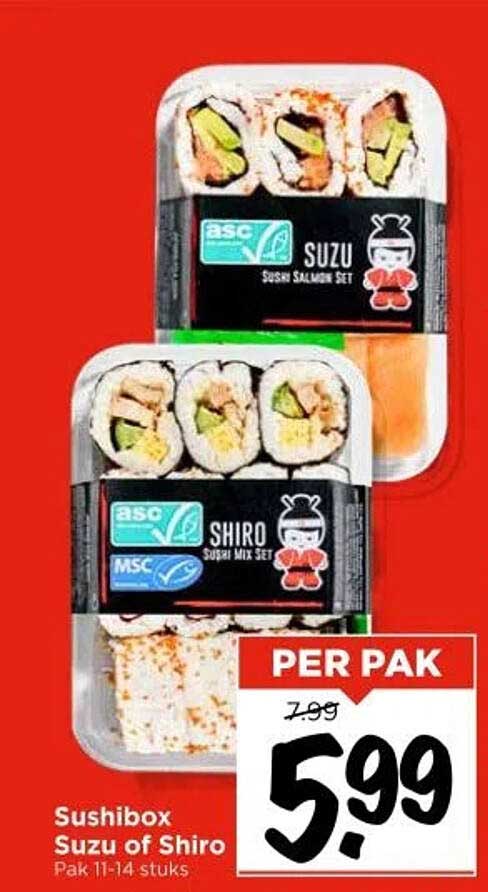 Bekijk nu de Sushibox Suzu of Shiro aanbieding in de Vomar folder. Deze aanbieding is geldig van 06-07-2025 tot en met 12-07-2025.