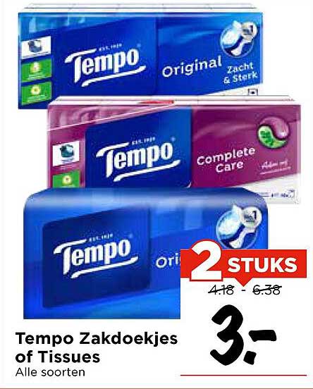 Bekijk nu de Tempo Zakdoekjes of Tissues 2 Stuks aanbieding in de Vomar folder. Deze aanbieding is geldig van 02-10-2025 tot en met 04-10-2025.