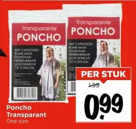 De normale prijs voor deze poncho is € 1,99, maar tijdens deze aanbieding koop je hem voor slechts € 0,99 per stuk! Dit betekent een besparing van 50%! Mis deze kans niet om jezelf te verzekeren van droge momenten dit seizoen.