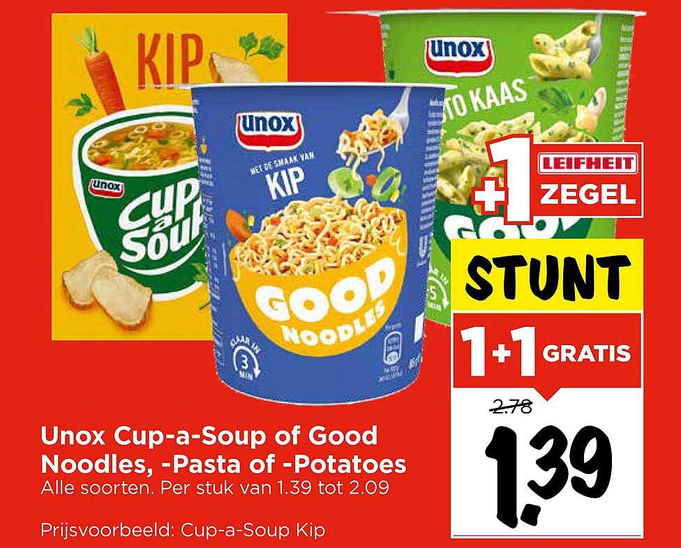 Op zoek naar een snelle en lekkere maaltijd? Dan is deze aanbieding van Unox perfect voor jou! Van 2 juli tot en met 5 juli kun je profiteren van een geweldige deal met de Unox Cup-a-Soup en Good Noodles. Deze producten zijn niet alleen snel te bereiden, maar ook nog eens ontzettend smakelijk. Ideaal voor een drukke dag of als je gewoon zin hebt in iets warms!