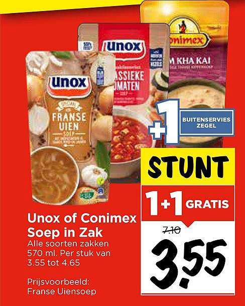 Heerlijk comfortfood staat voor je klaar met de Unox of Conimex Soep in Zak. Perfect voor drukke dagen of wanneer je gewoon zin hebt in een warme maaltijd. Met allerlei smaken om uit te kiezen, is er voor ieder wat wils. Deze aanbieding loopt van 23 juli 2025 tot en met 26 juli 2025, waardoor je zeker de kans hebt om te profiteren van deze smakelijke deal.