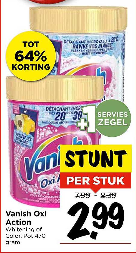 Bekijk de Vanish Oxi Action aanbieding bij Vomar! Deze fantastische aanbieding is nu beschikbaar in de nieuwste Vomar folder. Profiteer van deze kans en bespaar flink op je aankoop.