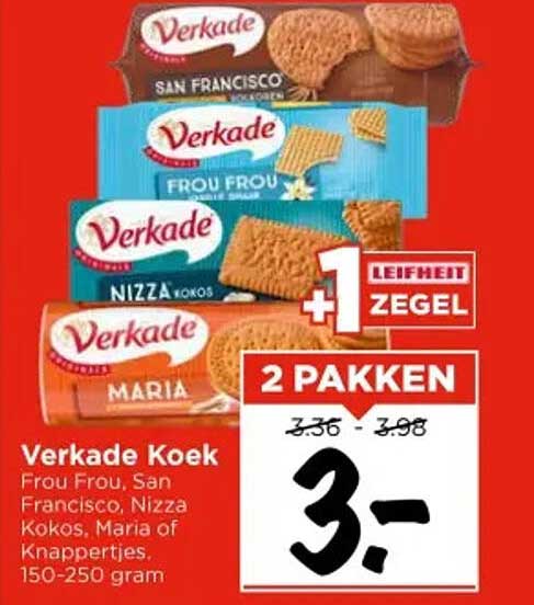 Bekijk nu de Verkade Koek Frou Frou, San Francisco, Nizza Kokos, Maria of Knappertjes, 150-250 gram aanbieding in de Vomar folder. Deze aanbieding is geldig van 18-06-2025 tot en met 21-06-2025.
