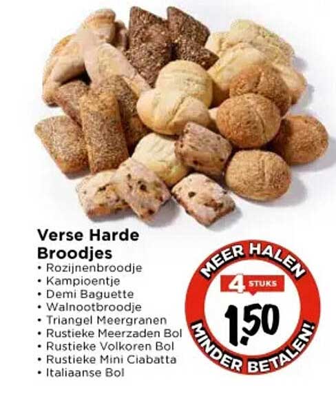 Als je op zoek bent naar smaakvolle en versgebakken broodjes, dan is dit de aanbieding voor jou! De Verse Harde Broodjes van Vomar zijn perfect voor elke gelegenheid, of je nu een ontbijt voor vrienden organiseert of gewoon zelf wilt genieten van een lekkere snack. Met verschillende soorten zoals Rozijnenbroodje, Demi Baguette en Italiaanse Bol, is er voor ieder wat wils.