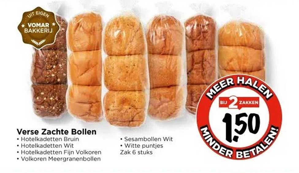 Met deze aanbieding betaal je slechts €1,50 minder wanneer je twee zakken aanschaft. Dit maakt het kopen van deze heerlijke verse bollen nog aantrekkelijker, aangezien je zo flink kunt besparen op je dagelijkse boodschappen. Vergelijk deze prijs met andere winkels en je zal zien dat de Vomar altijd de beste aanbiedingen heeft voor verse producten!