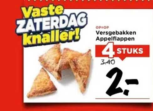 De reguliere prijs voor deze heerlijke appelflappen is €3,40, maar nu geniet je van een uitstekende korting: voor slechts €2,- krijg je vier stuks! Dit betekent dat je niet alleen je honger naar zoetigheid kunt stillen, maar ook een mooie besparing kunt maken. Een aanbieding die je niet wilt missen!