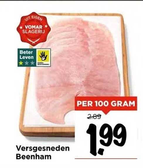De versgesneden beenham is afkomstig uit de Vomar slagerij, waar kwaliteit voorop staat. De beenham wordt zorgvuldig geselecteerd en vers voor je gesneden, wat zorgt voor een optimale smaak en textuur. Met een prijs van slechts € 1,99 per 100 gram is dit een aanbod dat je niet wilt laten lopen!