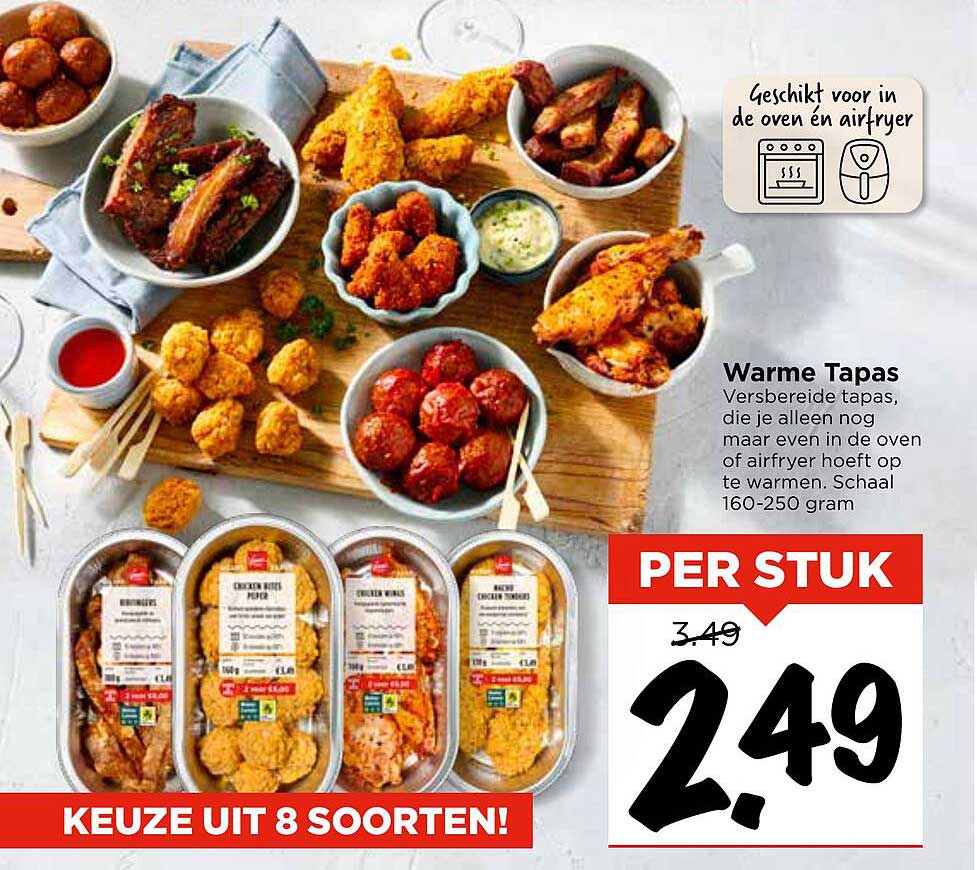 Met de Warme Tapas maak je van elke maaltijd een bijzondere gelegenheid. Of je nu kiest voor een borrelplank of een compleet diner, deze tapas zijn veelzijdig in gebruik. Ideaal voor een snelle hap, maar ook perfect voor feestjes. Laat je verrassen door de verschillende smaken die je kunt kiezen, stop ze in de oven of airfryer en je hebt in een handomdraai iets smakelijks op tafel.