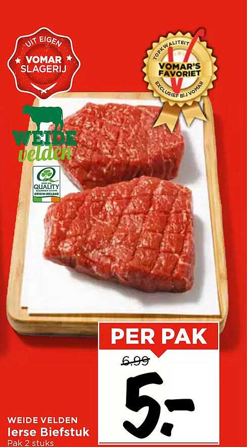 Bekijk de Weide Velden Ierse Biefstuk aanbieding bij Vomar! Deze fantastische aanbieding is nu beschikbaar in de nieuwste Vomar folder. Profiteer van deze kans en bespaar flink op je aankoop.