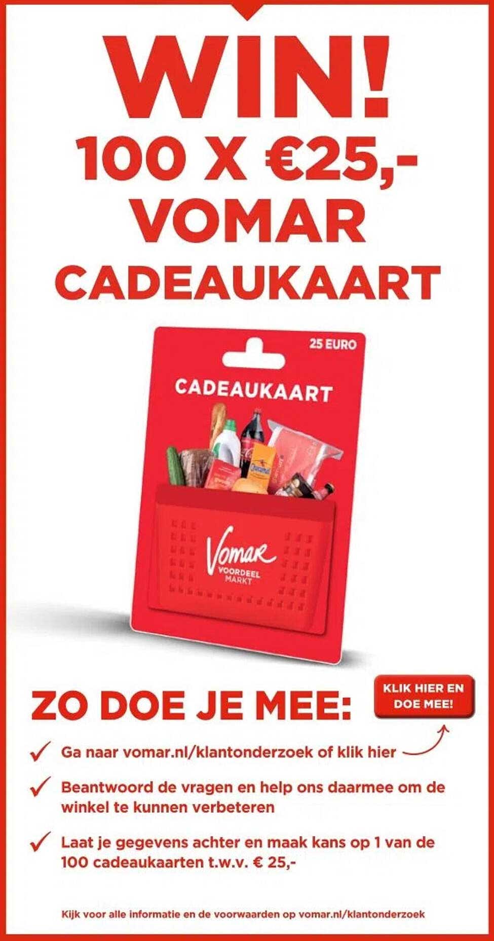 Bekijk nu de WIN! 100 X €25,- VOMAR CADEAUKAART aanbieding in de Vomar folder. Deze aanbieding is geldig van 25-09-2025 tot en met 27-09-2025.