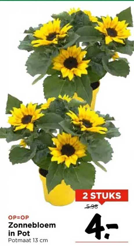Normaal kosten twee zonnebloemen in pot in de winkel €5,98, maar nu kun je ze voor slechts €4,- bemachtigen! Dit betekent dat je profiteert van een geweldige korting, ideaal voor iedereen die iets moois aan zijn huis of tuin wil toevoegen zonder de bank te breken.
