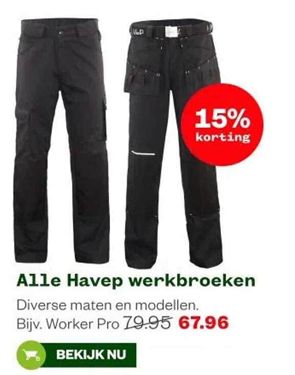 De oorspronkelijke prijs van de Havep werkbroeken bedraagt €79,95, maar met de huidige aanbieding betaal je slechts €67,96. Dit is een geweldige kans om te investeren in kwaliteitswerkwear tegen een scherpe prijs!