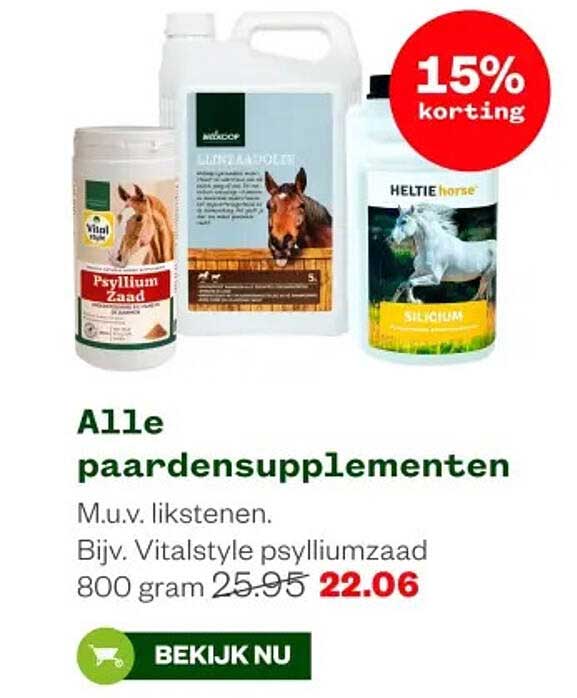Heb je een viervoeter die extra verzorging nodig heeft? Dan is deze aanbieding perfect voor jou! Deze week, van 23 tot en met 29 juni 2025, krijg je 15% korting op alle paardensupplementen bij Welkoop. Of je nu op zoek bent naar ondersteuning voor de spijsvertering of een ander supplement, deze aanbieding biedt een unieke kans om kwaliteitsproducten voor je paard aan te schaffen.