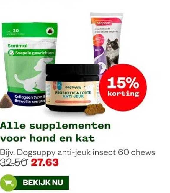 Heb je een vierbenige vriend die wel wat extra ondersteuning kan gebruiken? Deze week is er een geweldige aanbieding voor alle supplementen voor hond en kat. Met een aantrekkelijke korting van 15%, zijn deze producten niet alleen voordelig maar ook van hoge kwaliteit. Of je nu zoekt naar iets om de gewrichten van je hond te ondersteunen of een supplement om de huid van je kat te verbeteren, hier vind je het allemaal. Mis deze kans niet!
