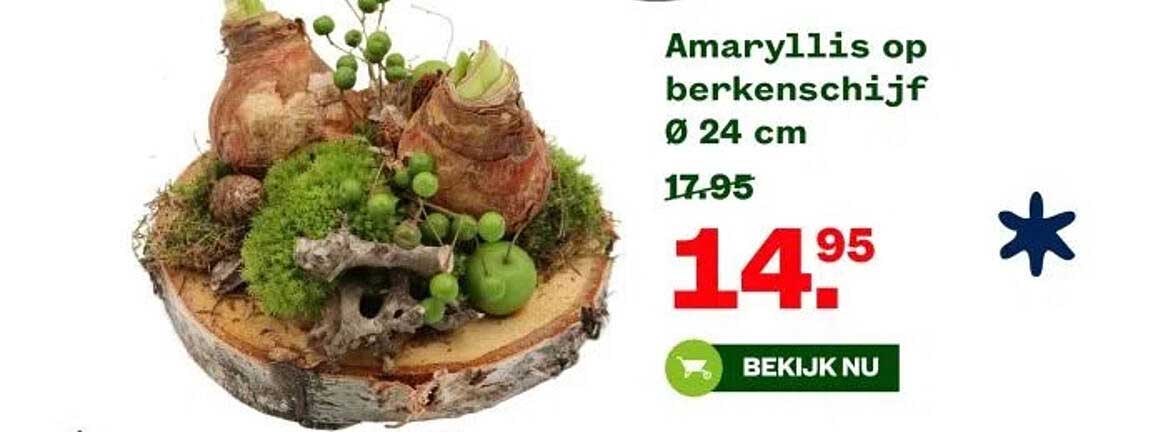 Bekijk nu de Amaryllis op berkenschijf Ø 24 cm aanbieding in de Welkoop folder. Deze aanbieding is geldig van 27-10-2025 tot en met 02-11-2025.
